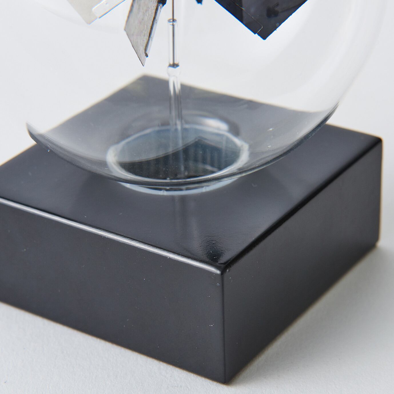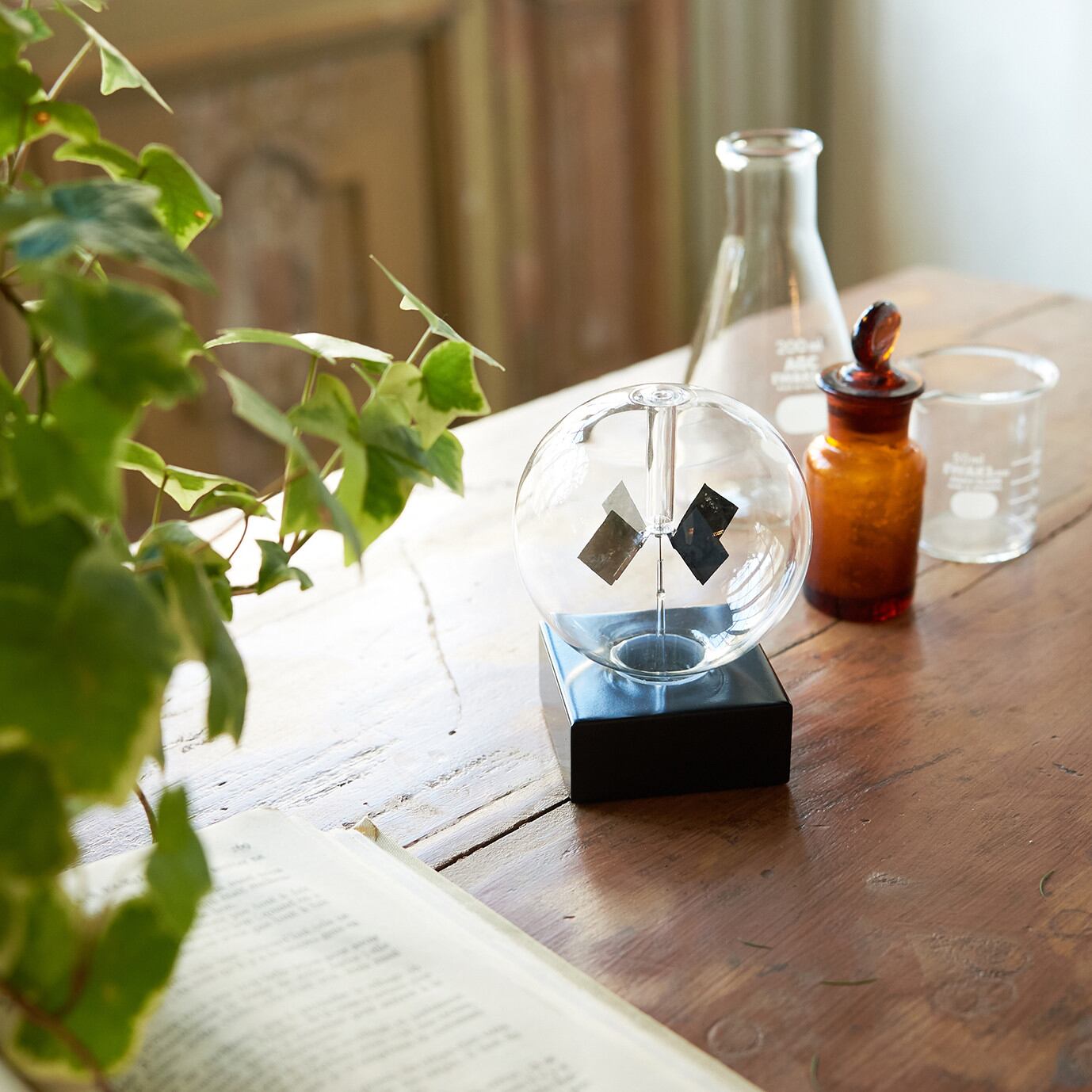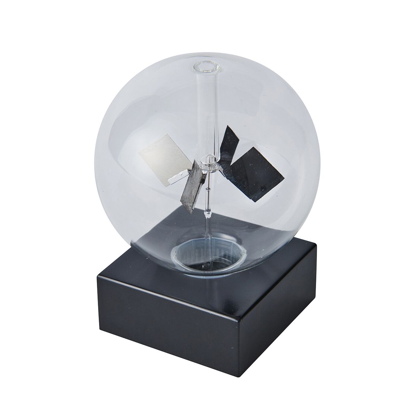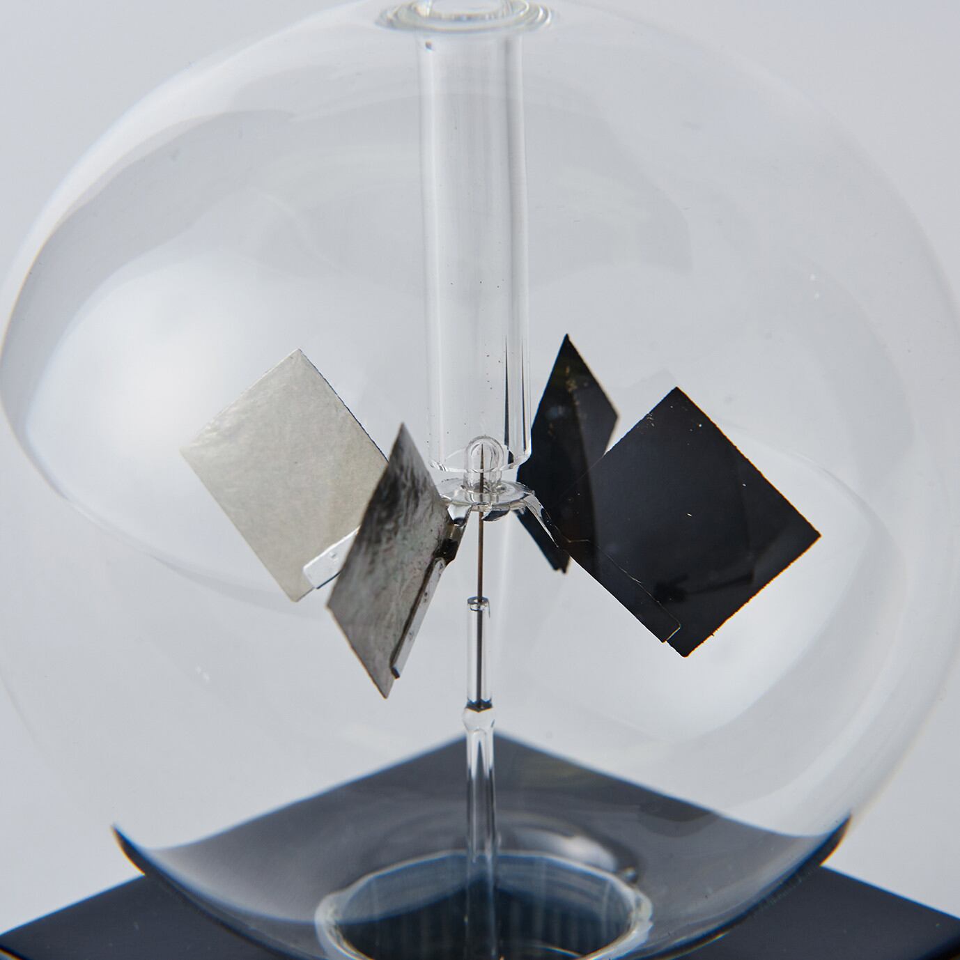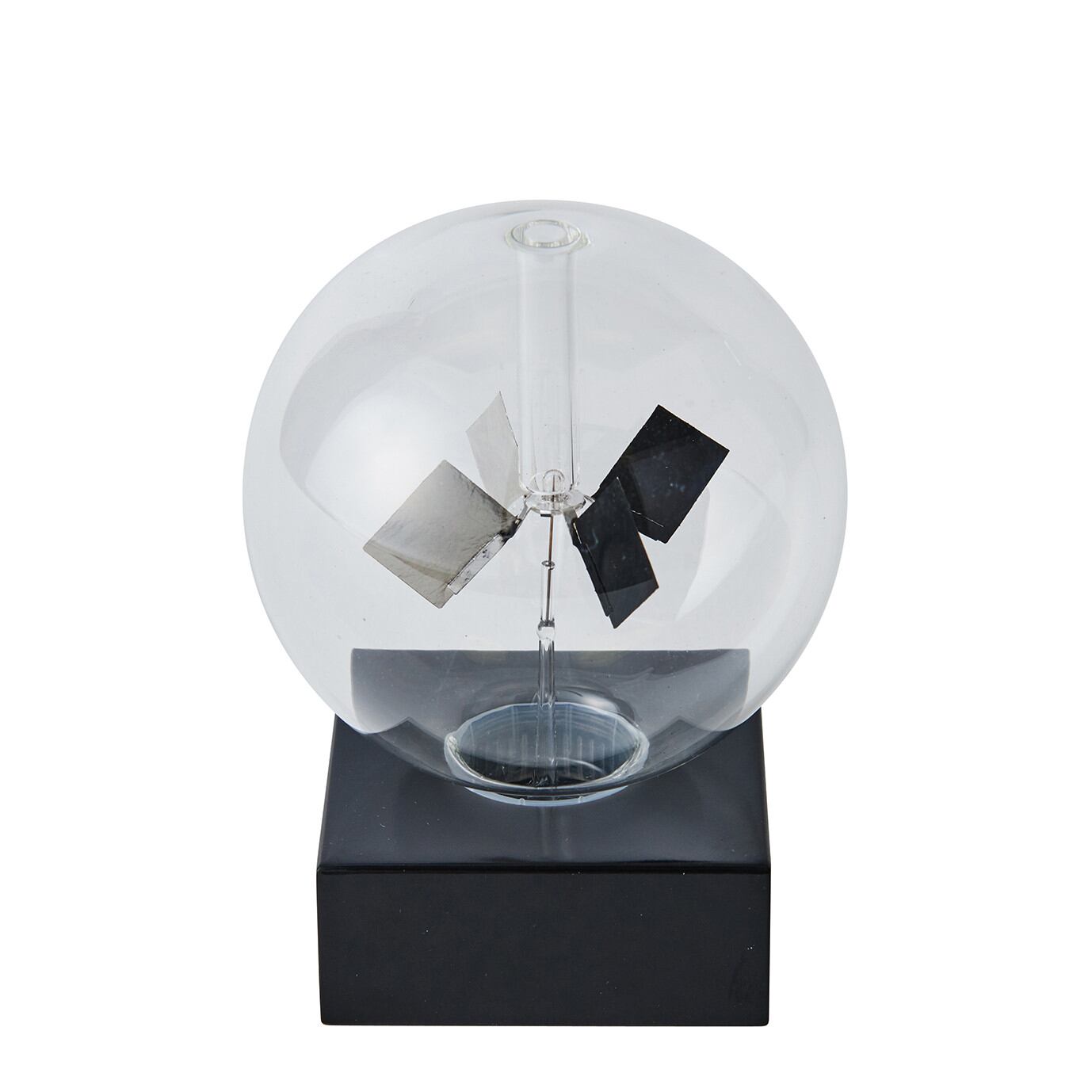 回転する原理ガラスの中の羽根の片面は黒で塗られています。光をあてると黒い羽根の面は光を吸収して温度が上がります。その表面付近の気体の分子活動が活発になり、羽根の面に分子衝突による圧力が他面と差を生じるので、羽根は塗られていない面の方に回転します。(ガラス球内部は半真空状態になっています)