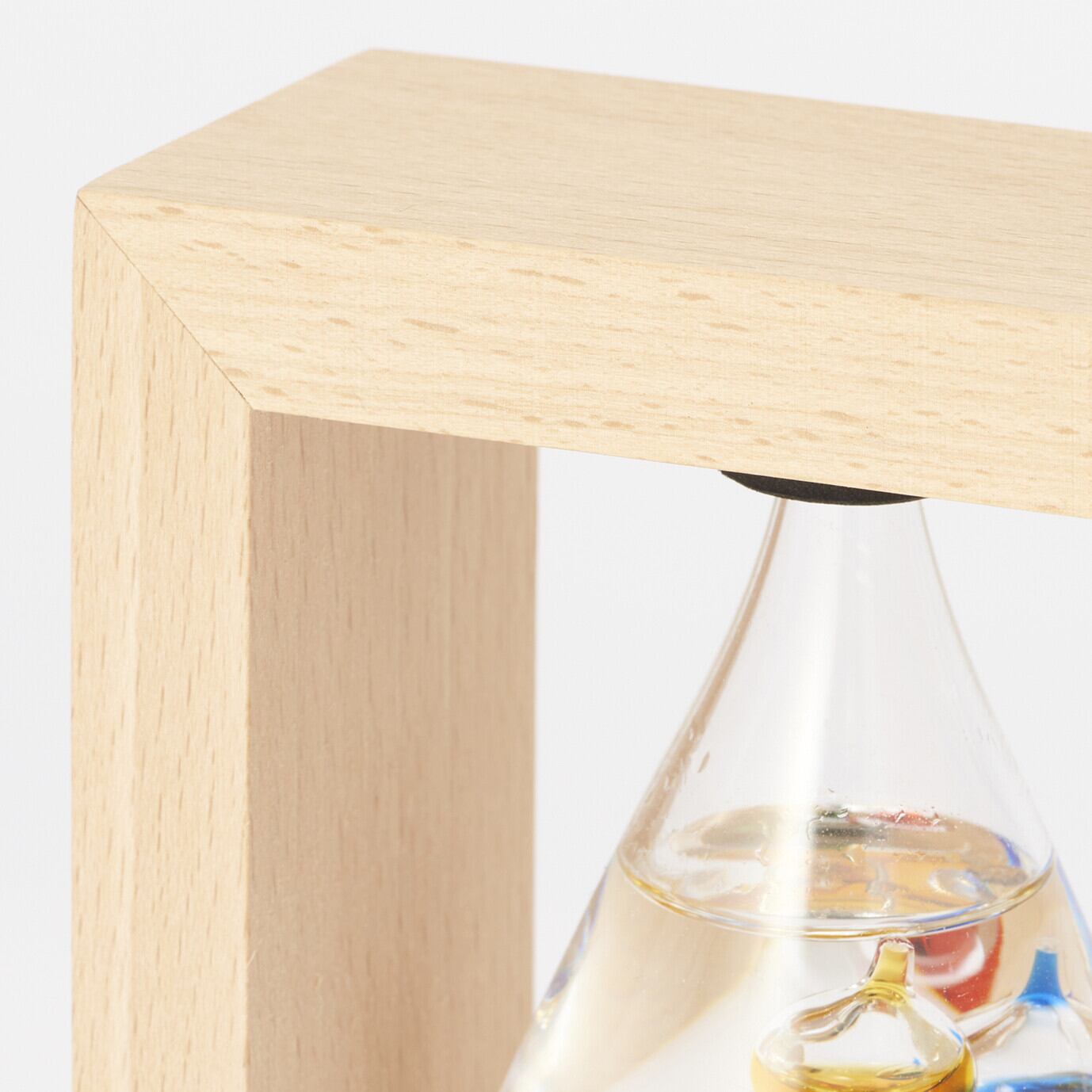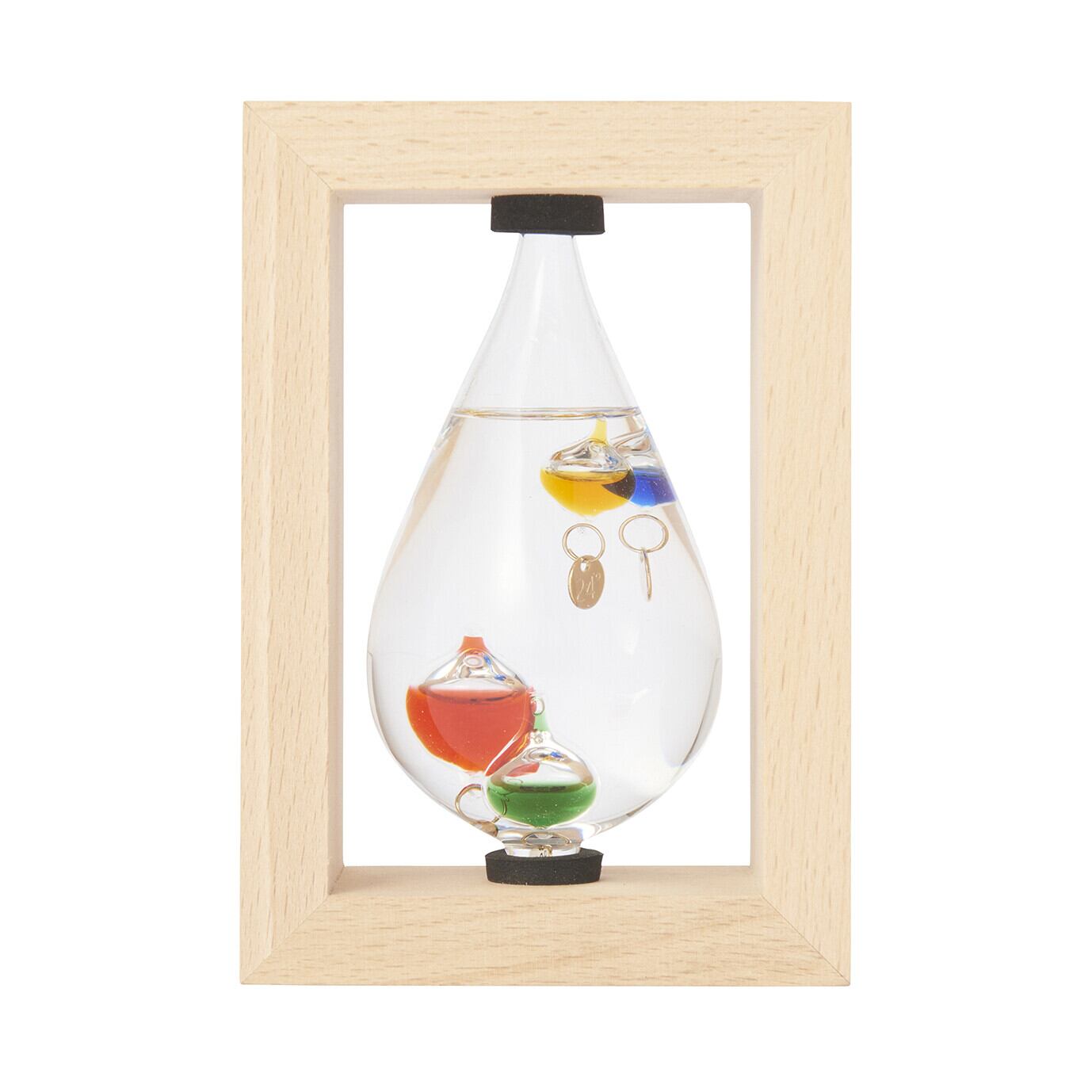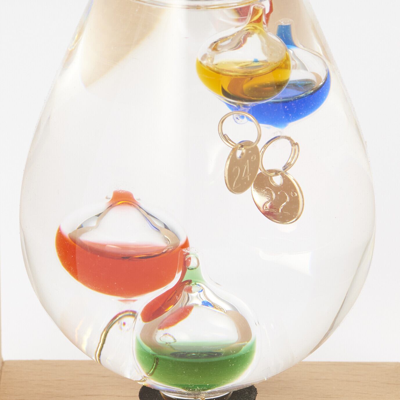 物理学者のガリレオ・ガリレイは液体の比重が気温によって変化することを発見。その原理を使ってこの温度計は作られております。気温によって上下するガラスの球体が気温を示します。実際の気温は上層部に浮いているガラス球体に付いているプレートで読み取ります。