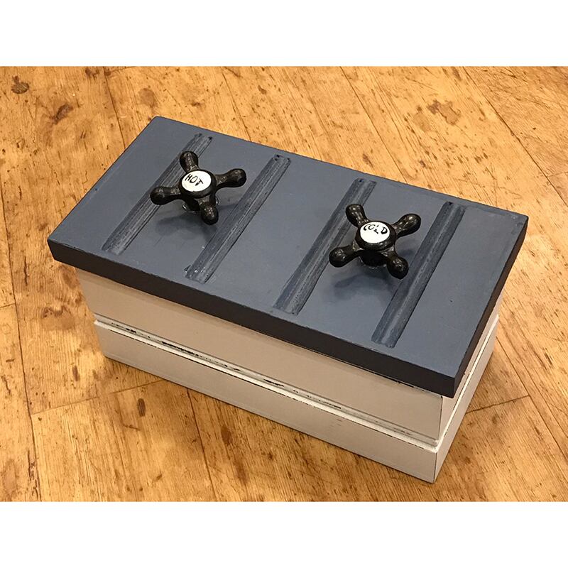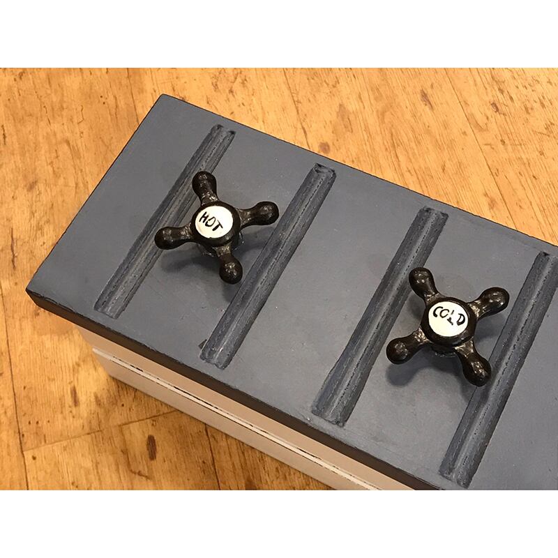木製でしっかりとした作りで、蛇口の取っ手がついた小物入れです。