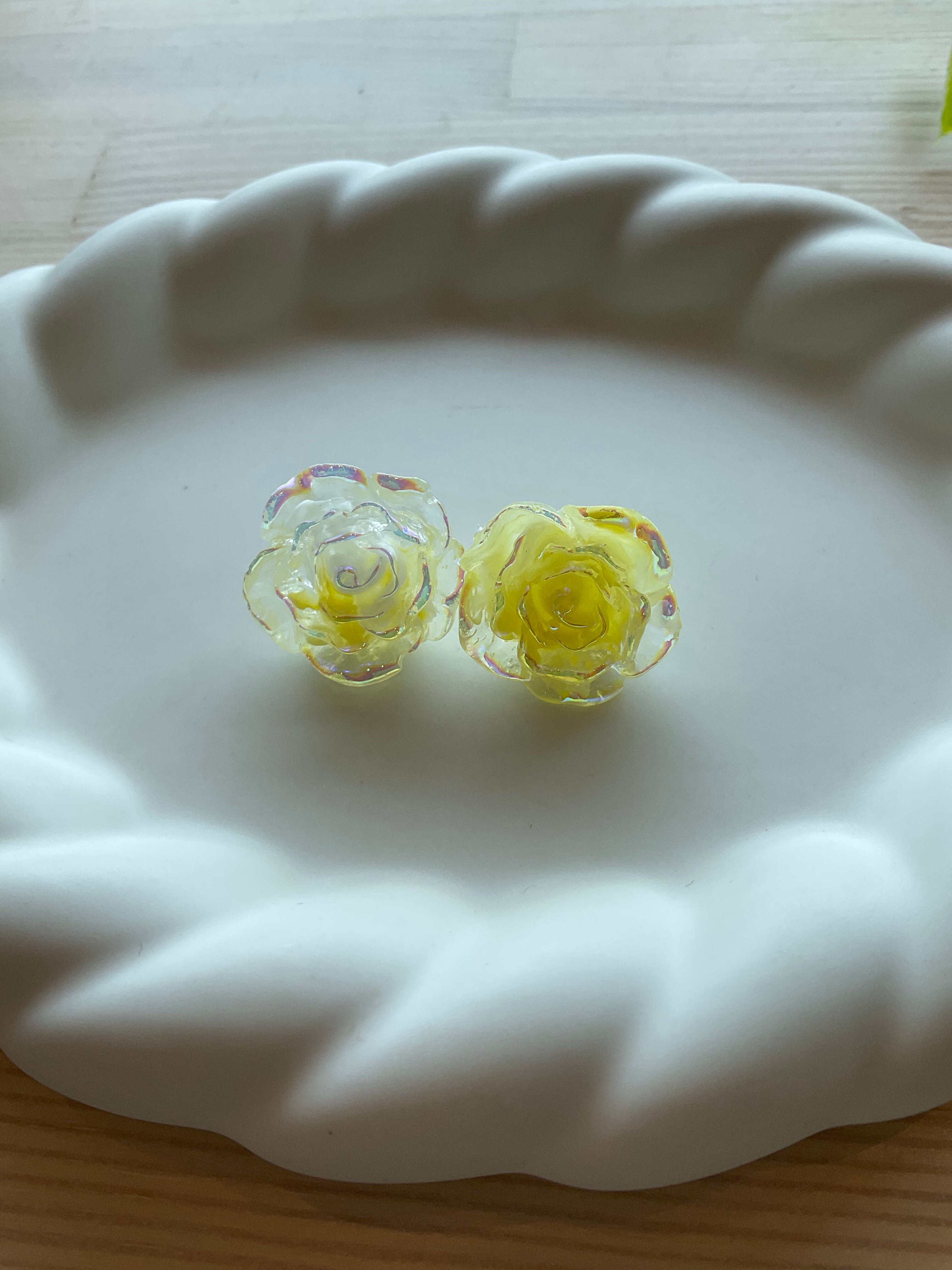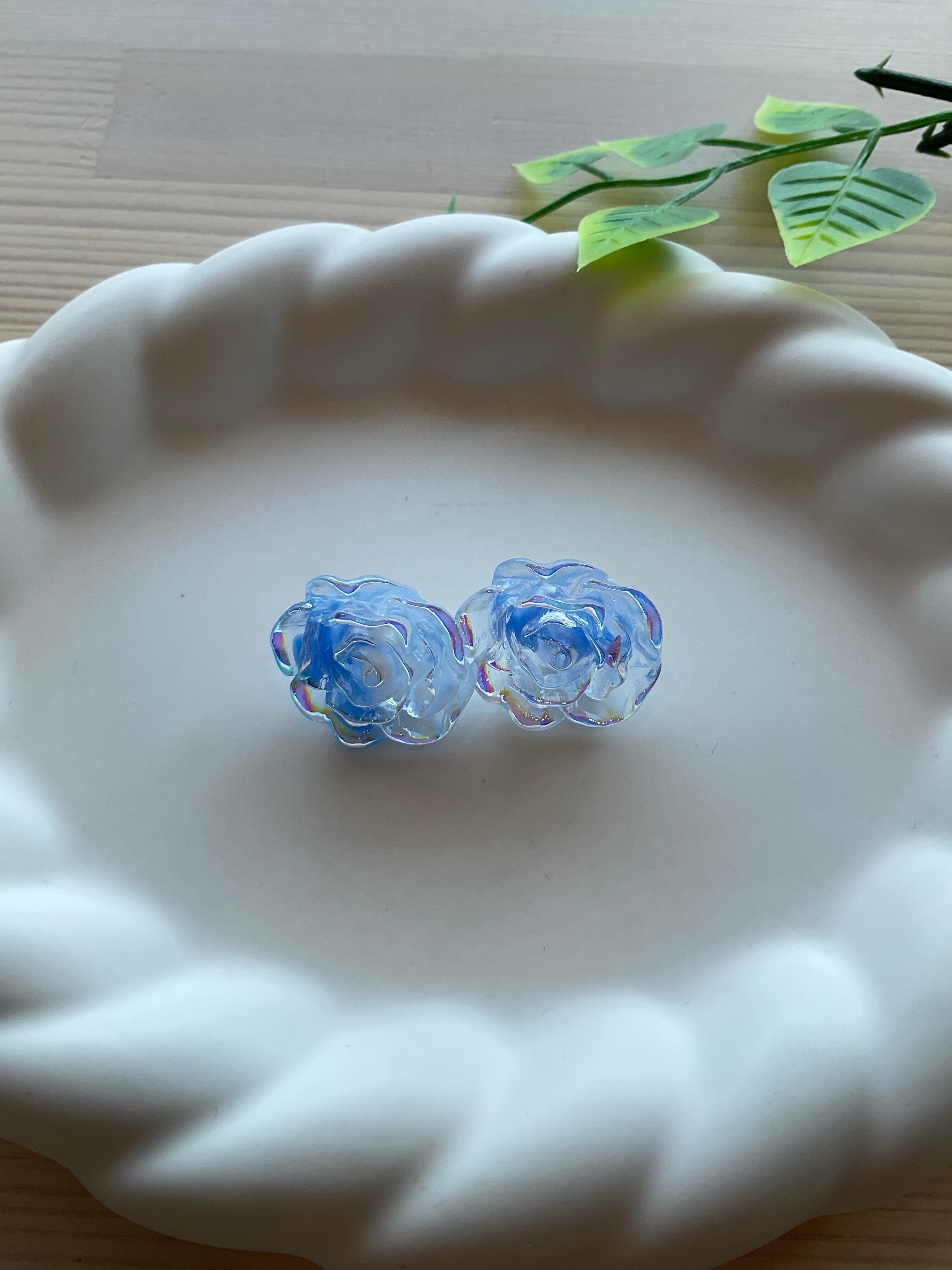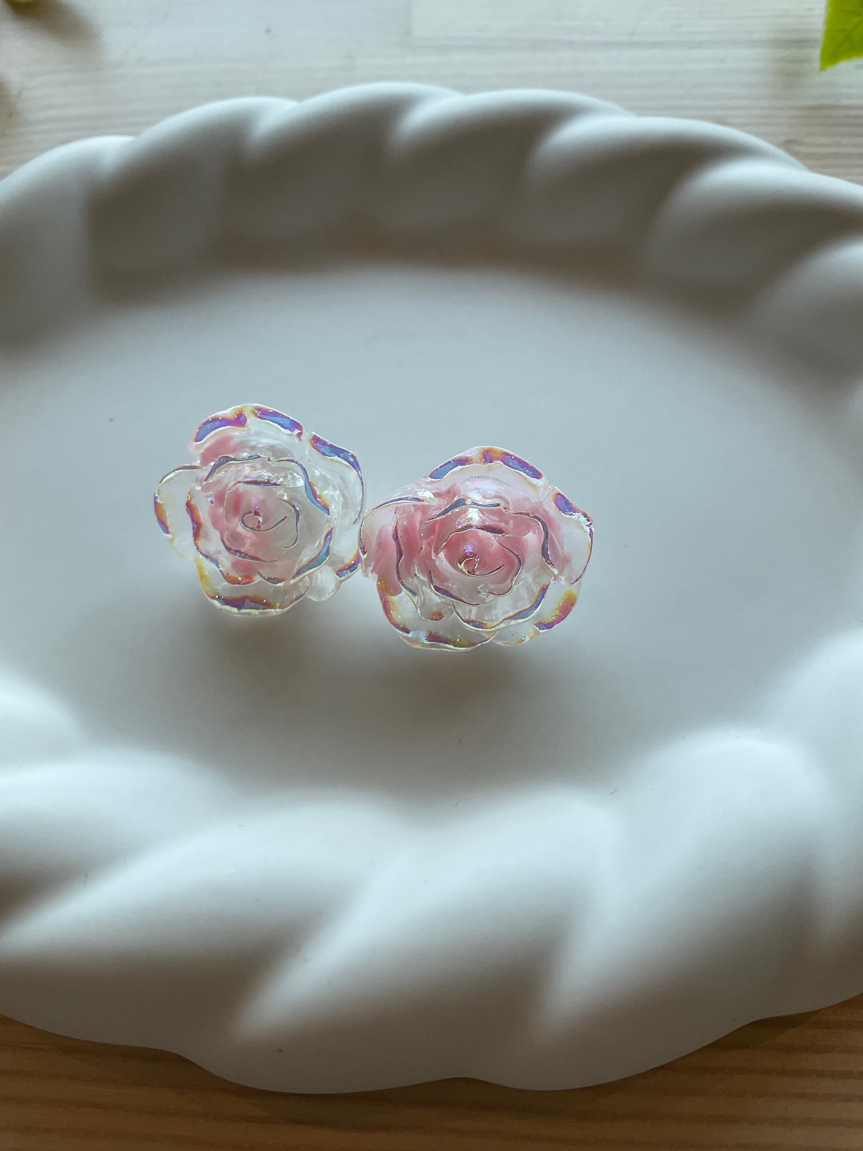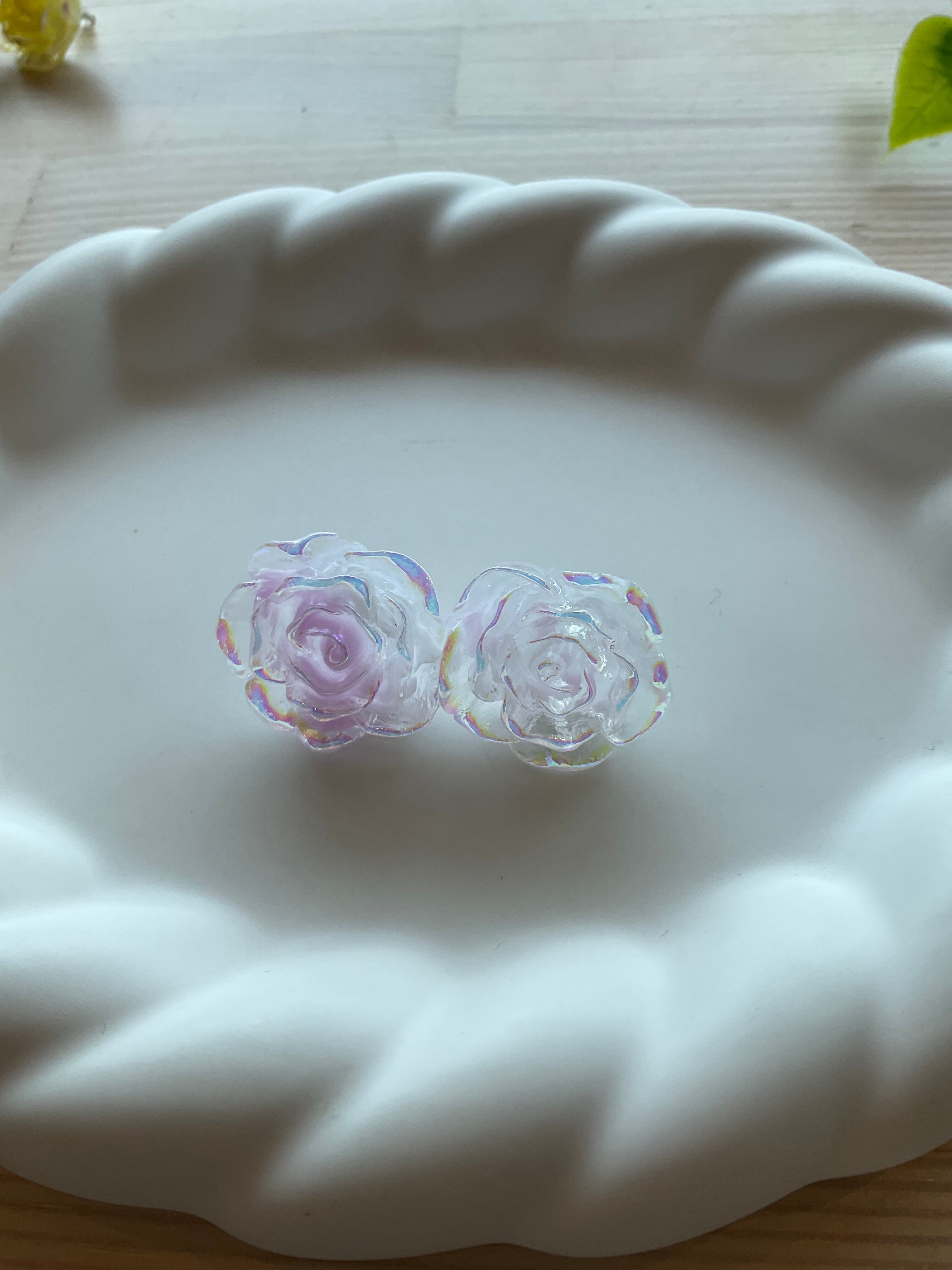 アクリル素材にほんのり色が入っていて、バラの縁部分がオーロラ色になった、涼し気な可愛いらしいピアス